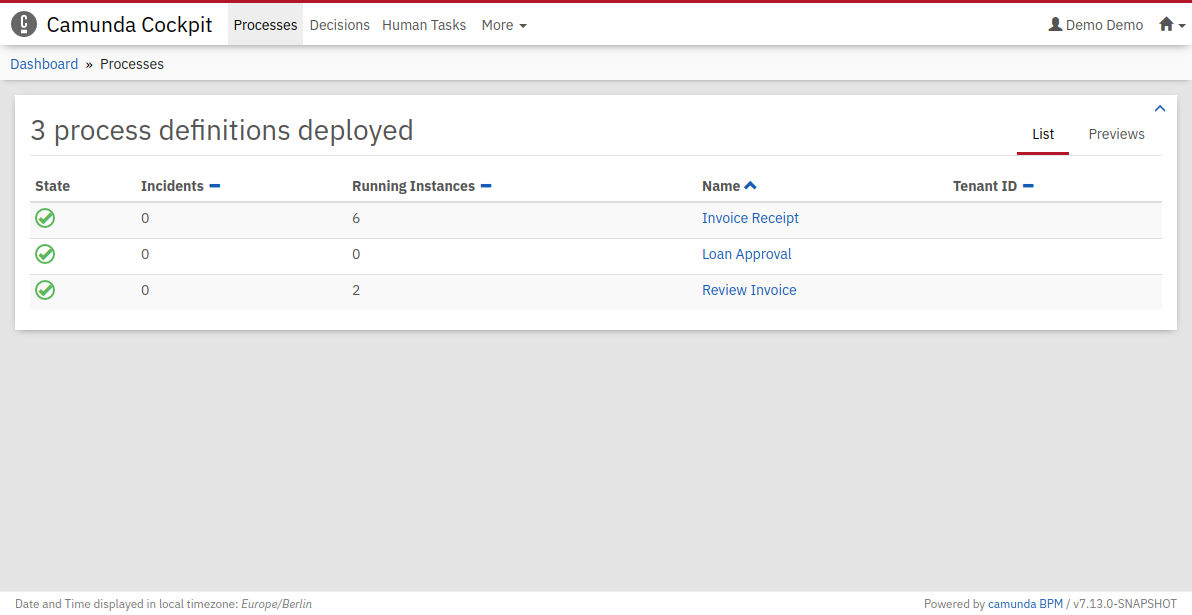 Now use Cockpit to check if the process is successfully deployed. Go to http://localhost:8080/fluxnova/app/cockpit. Log in with demo / demo. Your process Loan Approval is visible on the dashboard.
