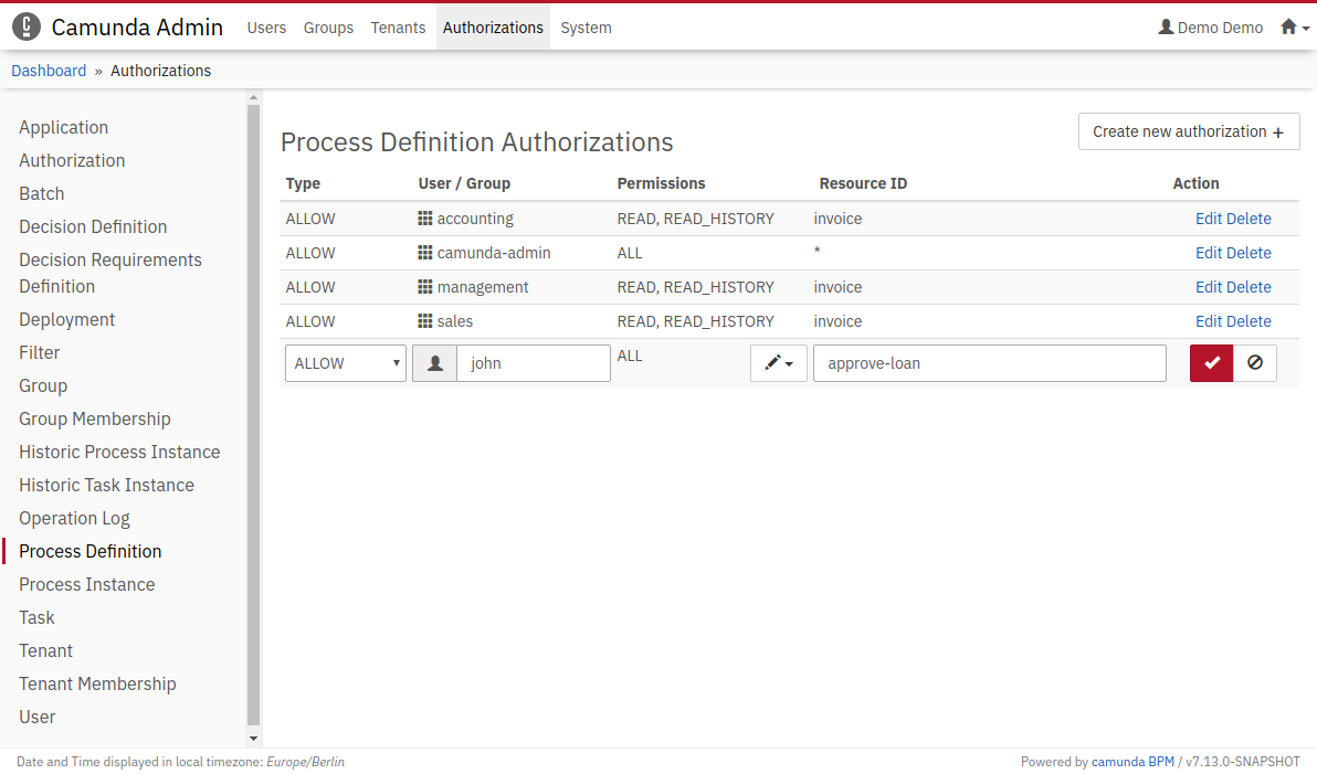 To allow the user john to see the process definition Loan Approval, you have to go to Fluxnova Admin (http://localhost:8080/fluxnova/app/admin/default/#/authorization?resource=6). Next, click on the button Create new authorization to add a new authorization on the resource process definition. Now you can give the user john all permissions on process definition approve-loan. When you are done, submit the new authorization.