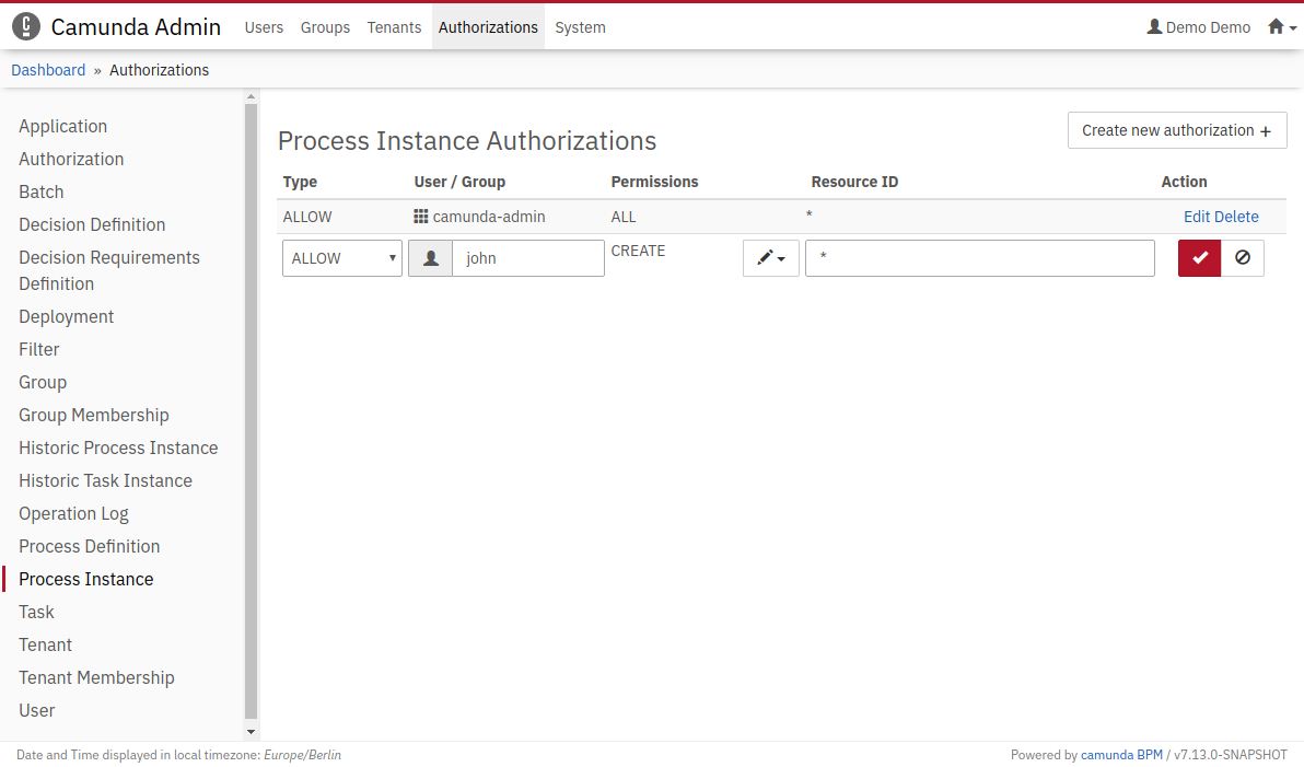 Now create a second authorization for the process instance resource. Set the permission to CREATE.