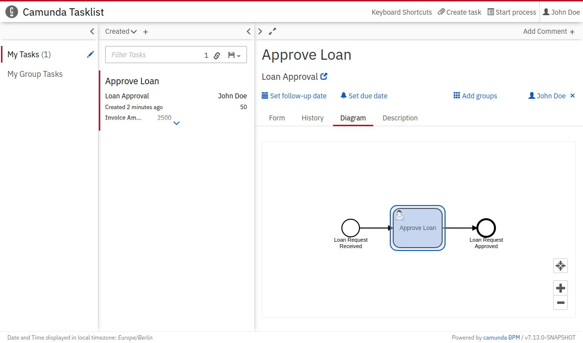 Log out of Admin. Go to Tasklist (http://localhost:8080/fluxnova/app/tasklist) and log back in with the user credentials “john / john”. Now you see the Approve Loan task in your Tasklist. Select the task and click on the Diagram tab. This displays the process diagram highlighting the User Task that is waiting for you to work on it.