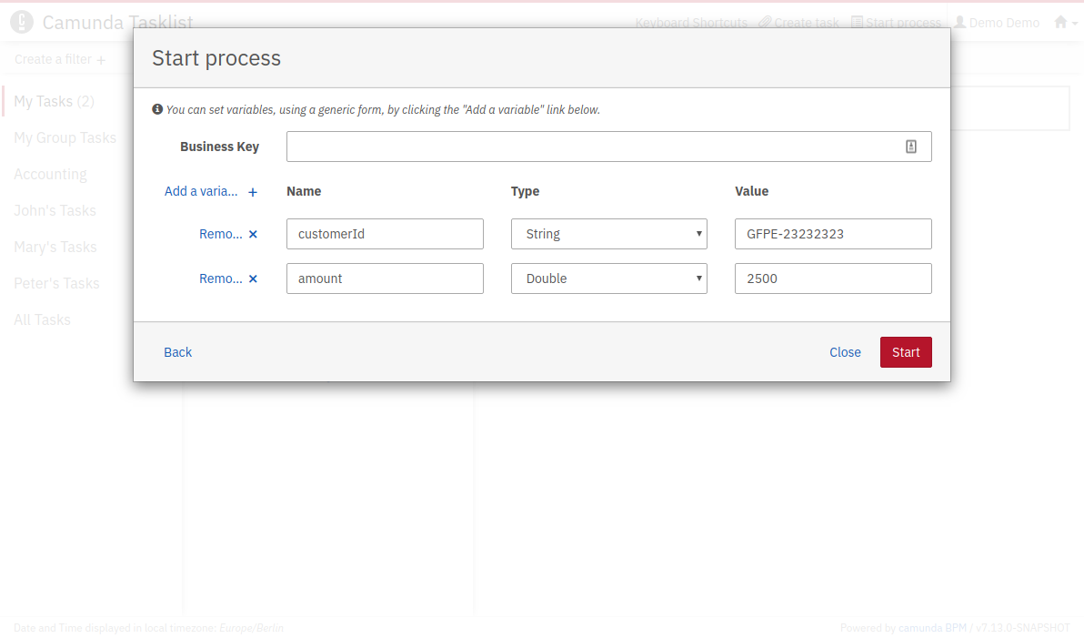 The generic form can be used whenever you have not added a dedicated form for a User Task or a Start Event. Click on the Add a variable button to get a new row. Fill in the form as shown in the screenshot. When you are done, click Start.