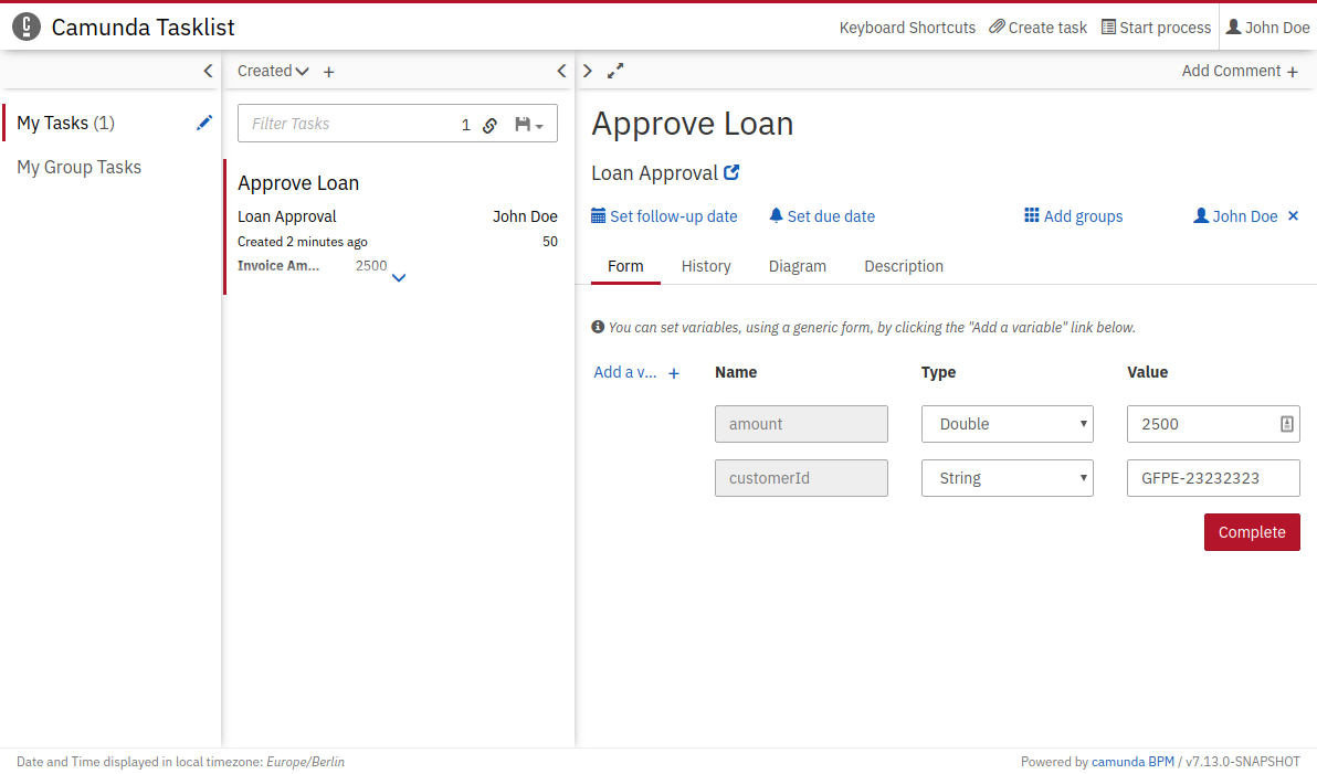 Next, go to Fluxnova Tasklist (http://localhost:8080/fluxnova/app/tasklist). Click on the button to start a process instance. This opens a dialog where you can select Loan Approval from the list. Now you can set variables for the process instance using a generic form.