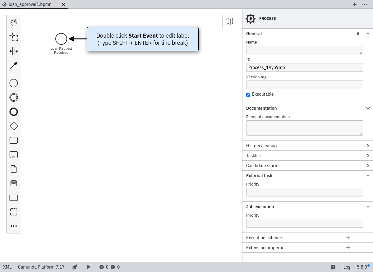 Double-click on the Start Event. A text box opens. Type “Loan Request Received”.