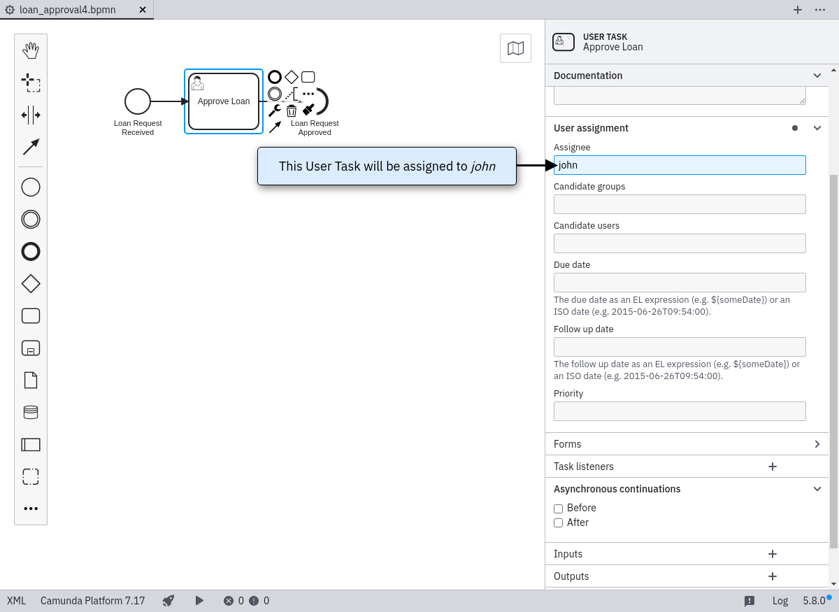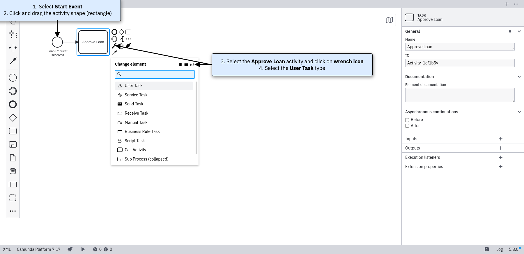 Click on the start event. From its context menu, select the activity shape (rectangle) and drag it to a good position. Name it Approve Loan. Change the activity type to User Task by clicking on it and using the wrench button.