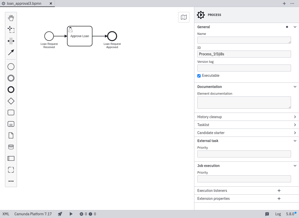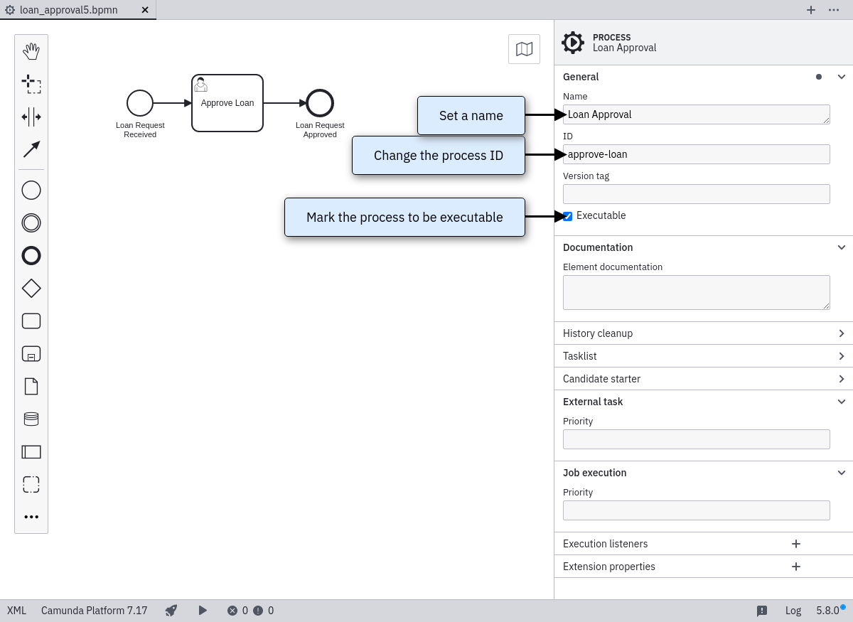 First, configure an ID for the process. Type approve-loan in the property field Id. The property ID is used by the process engine as identifier for the executable process and it is best practice to set it to a human-readable name.
