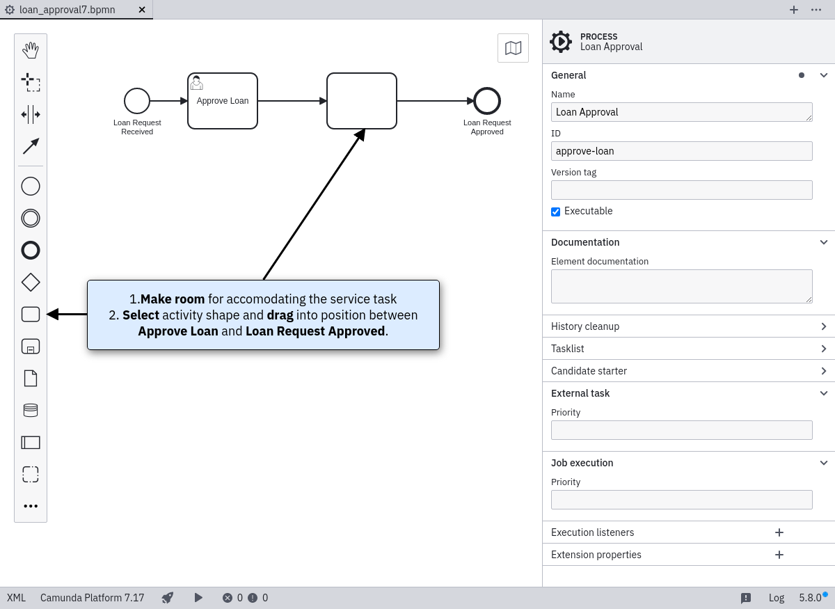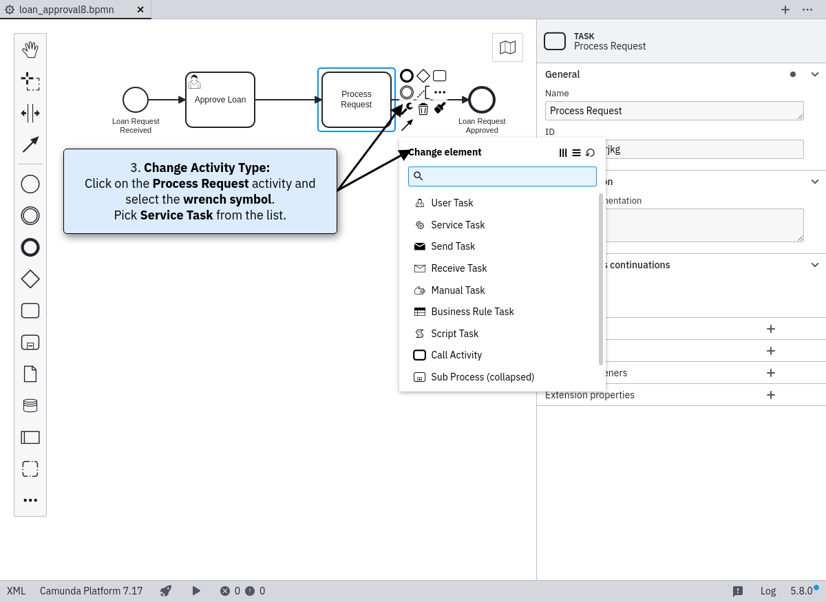 Use the Fluxnova Modeler to add a service task after the user task. To do so, select the activity shape (rectangle) and drag it onto a sequence flow (see screenshot). Name it Process Request. Change the activity type to Service Task by clicking on it and using the wrench button.