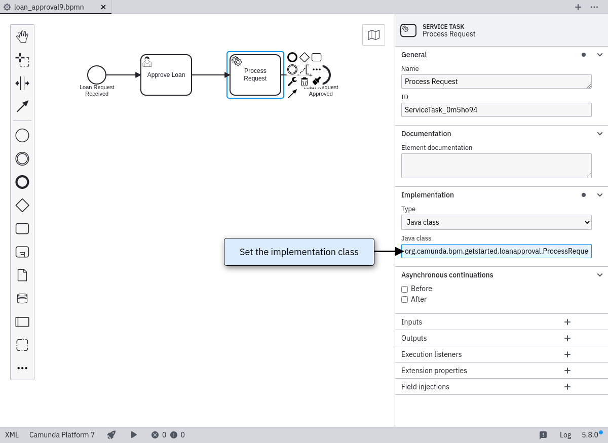Use the properties view to reference the service task in the process (see screenshot). You need to provide the fully qualified classname of your class in the Java Class property field. In our case this is org.finos.fluxnova.bpm.getstarted.loanapproval.ProcessRequestDelegate