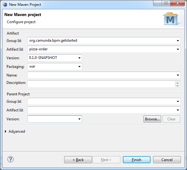 When you are done, click Finish. Eclipse sets up a new Maven project. The project appears in the Project Explorer view.