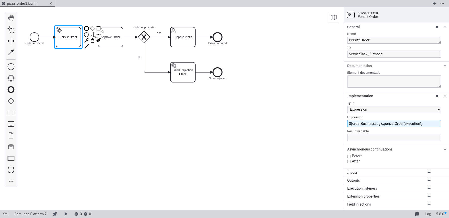 , a new instance of the order entity is created and the order instance will be initialized with the values which are currently saved as process variables. After the newly created instance is flushed to the database, its order id is set and the other process variables are no longer needed, so we remove the order properties and only add the order id as a process variable.