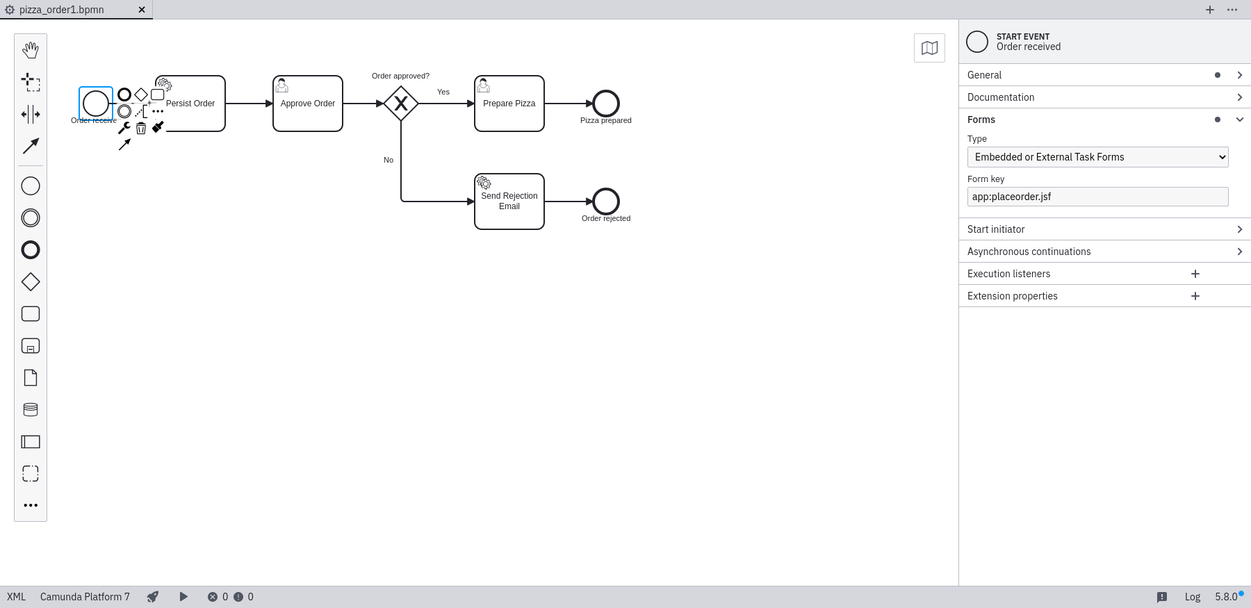 If you open the Tasklist and start a new process instance for the pizza order process, the JSF form is displayed.