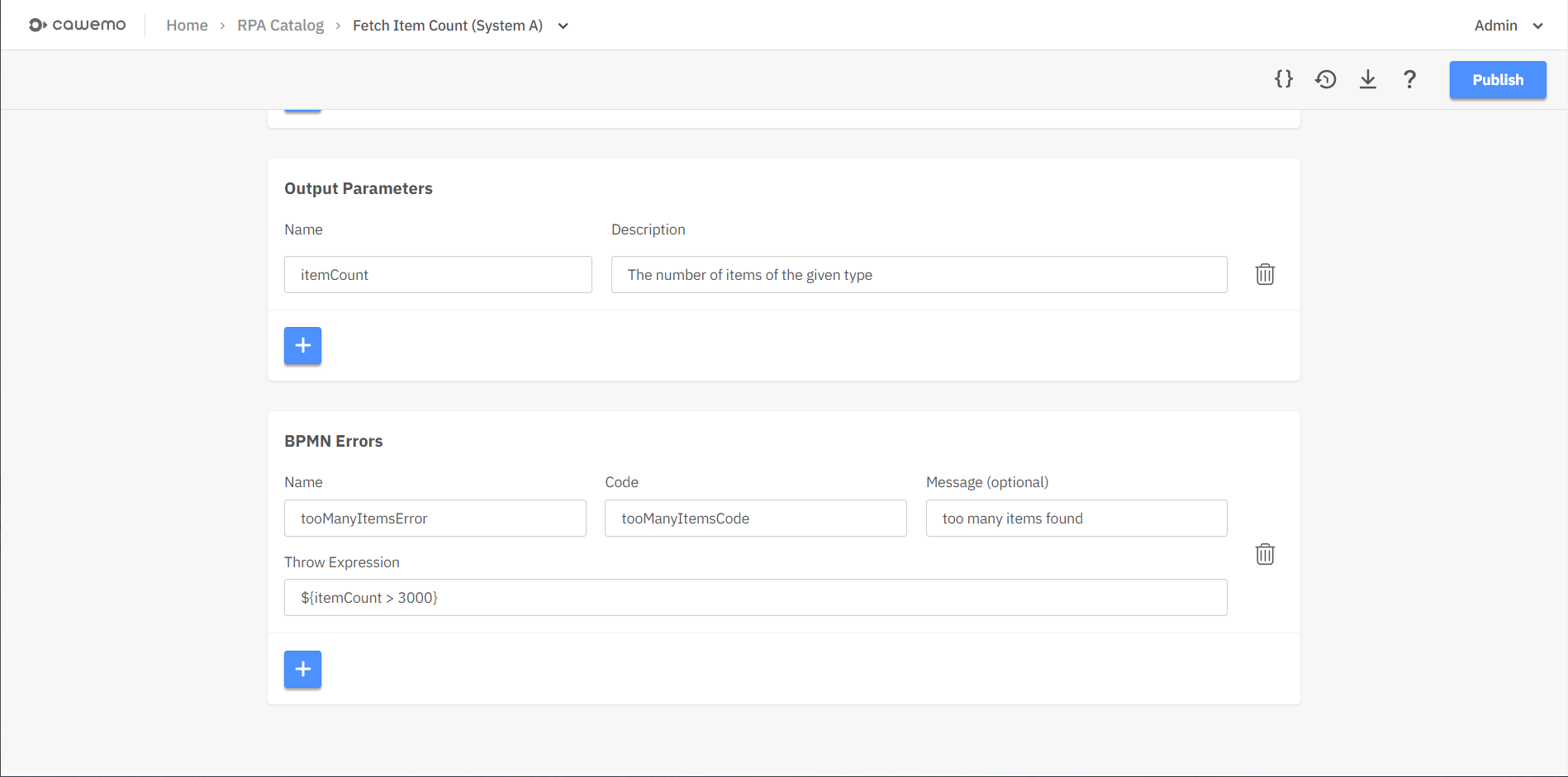 Please remember, before the template can be used in the Fluxnova Modeler, it needs to be published once by clicking the “Publish” button in the upper right corner. After publishing the template, you can synchronize it in the Fluxnova Modeler and update the template there at your service task. You can now adjust the error definition details if necessary.