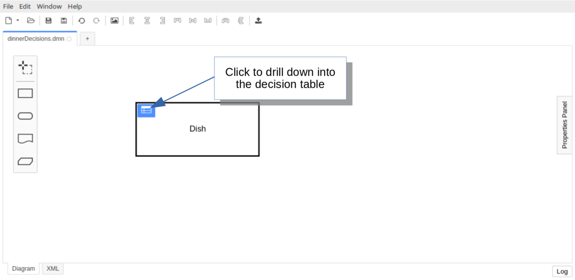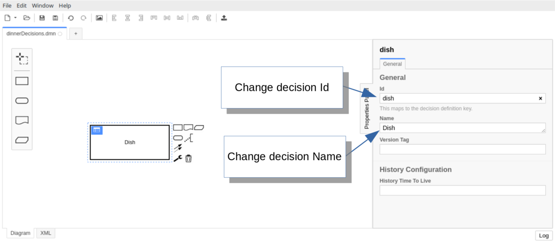 Start by setting the name and the id of the decision. Select the decision, open the Properties Panel on the right side and change the text to “dish” as the technical id of the decision which is used to reference the decision inside the process application.