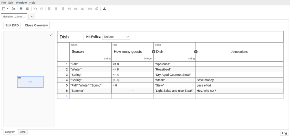 In this section you learn how to create your first DMN Decision Table with the Fluxnova Modeler. The table will contain the decision logic about the desired dish for a given season and guest count.