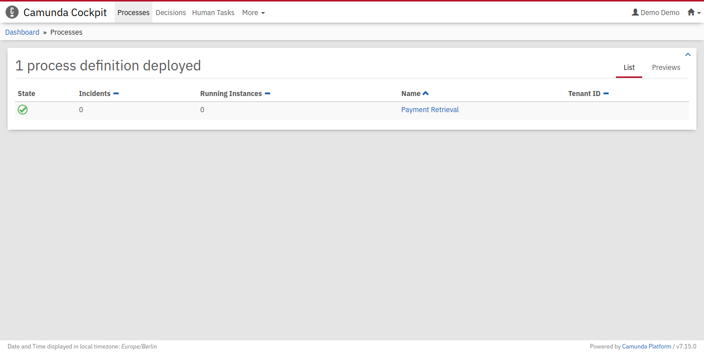 Next, use Cockpit to see if the process was successfully deployed. Go to http://localhost:8080/fluxnova/app/cockpit/ and log in with the credentials demo / demo. Your process Payment Retrieval should be visible on the dashboard.