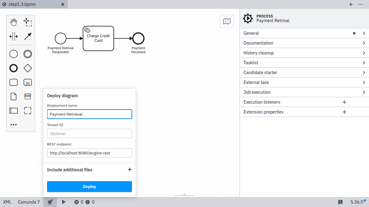 In order to deploy the Process, click on the deploy button in the Fluxnova Modeler, then give it the Deployment Name “Payment Retrieval” and click the Deploy button. From version 3.0.0 on, you will be required to provide an URL for an Endpoint Configuration along with Deployment Details. This can be either the root endpoint to the REST API (e.g. http://localhost:8080/engine-rest