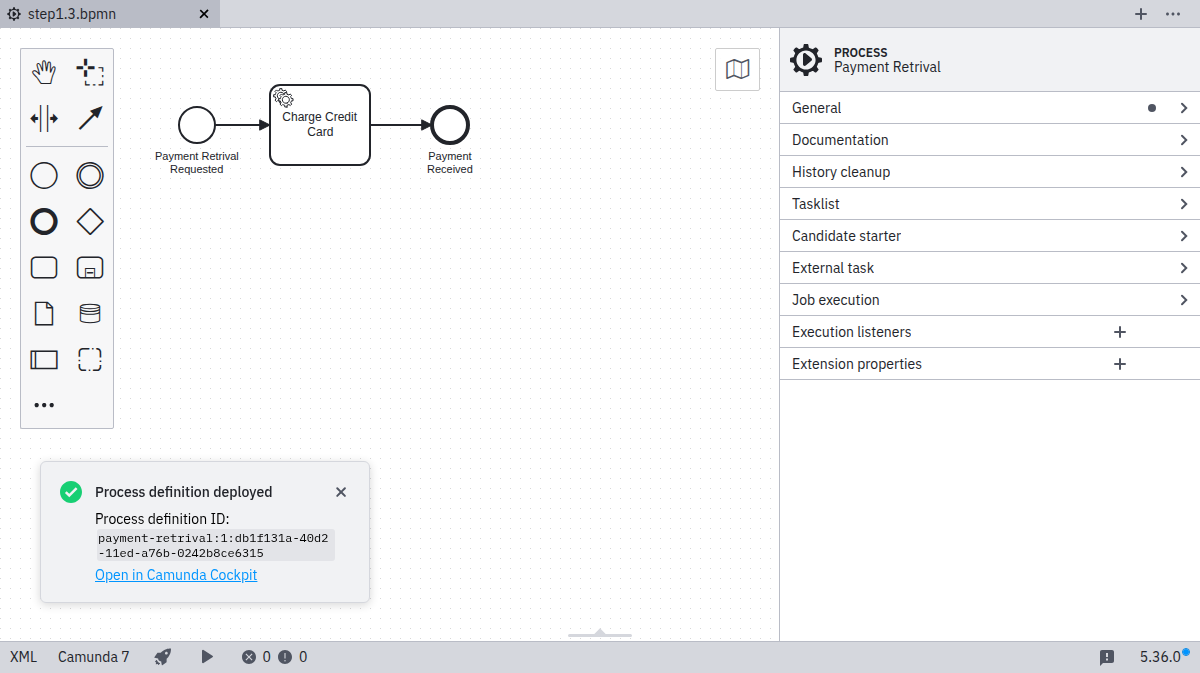 In the next step, you’ll deploy the Process and start a new instance so you can see that your simple process is working correctly.