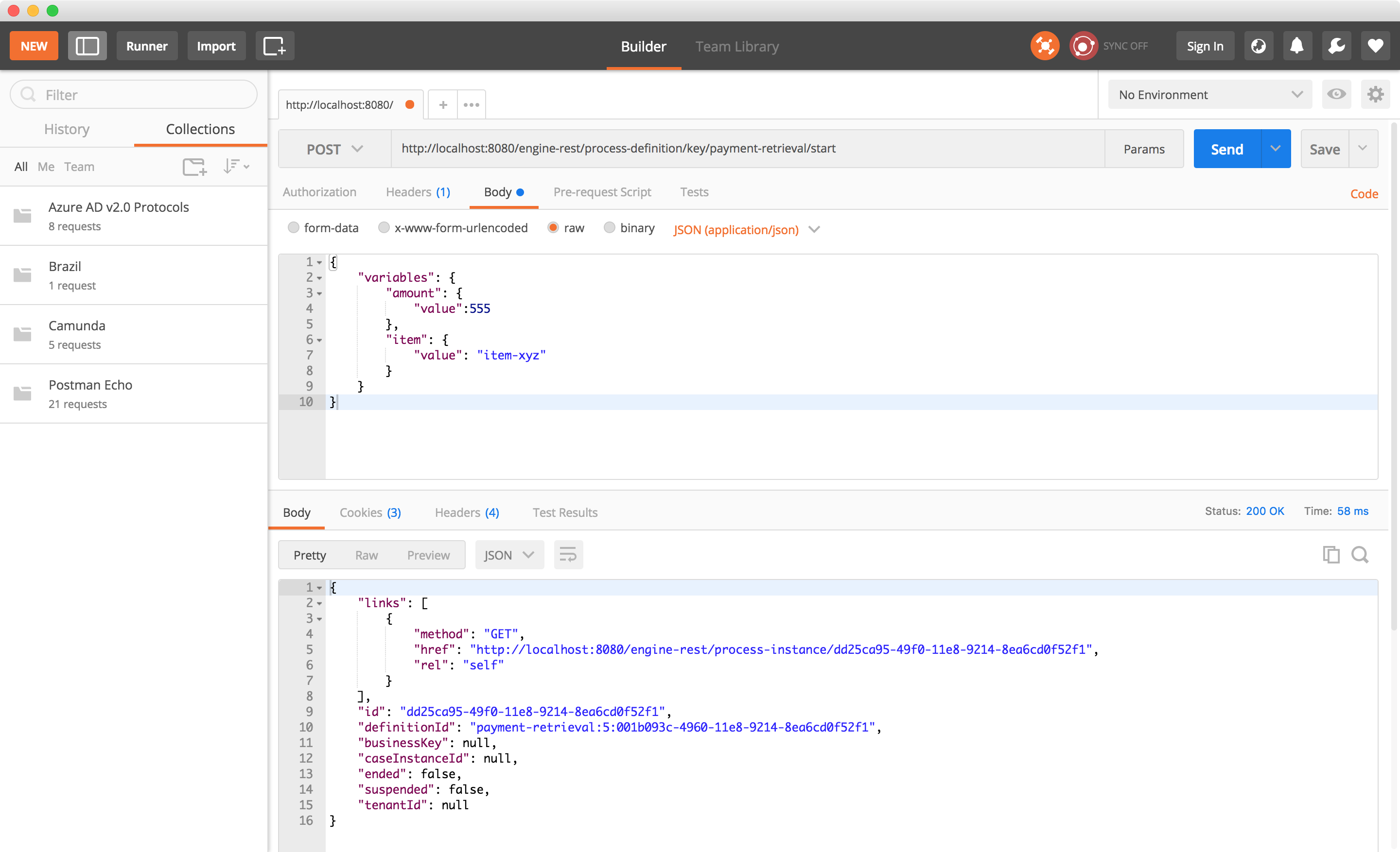 curl -H "Content-Type: application/json" -X POST -d '{"variables": {"amount": {"value":555,"type":"integer"}, "item": {"value":"item-xyz"} } }' http://localhost:8080/engine-rest/process-definition/key/payment-retrieval/start