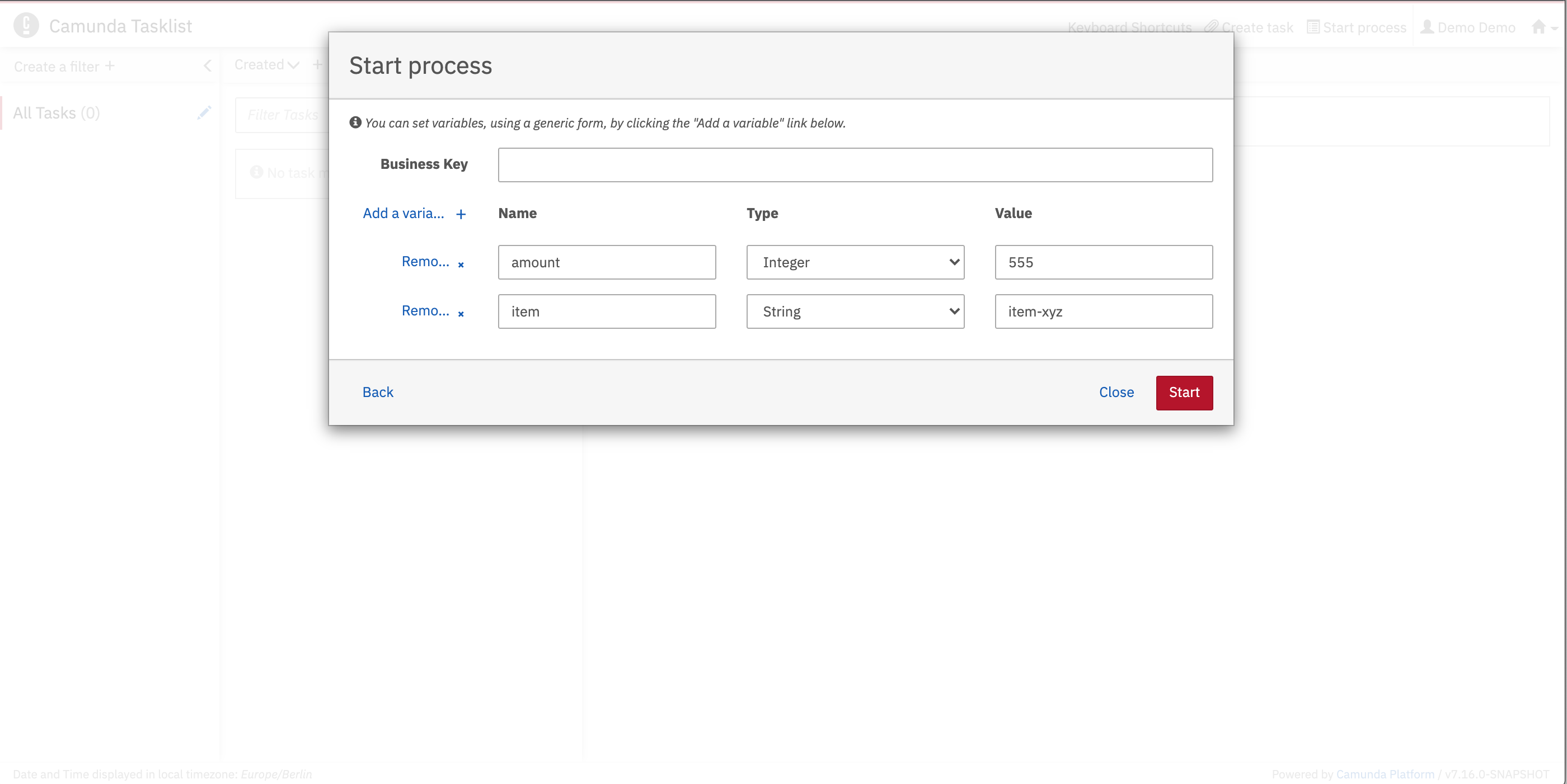 Go to Tasklist (http://localhost:8080/fluxnova/app/tasklist/) and log in with the credentials “demo / demo”. Click on the button to start a process instance for the Payment Retrieval Process. Next, set variables for the process instance using the generic form as we learned in the User Tasks section.
