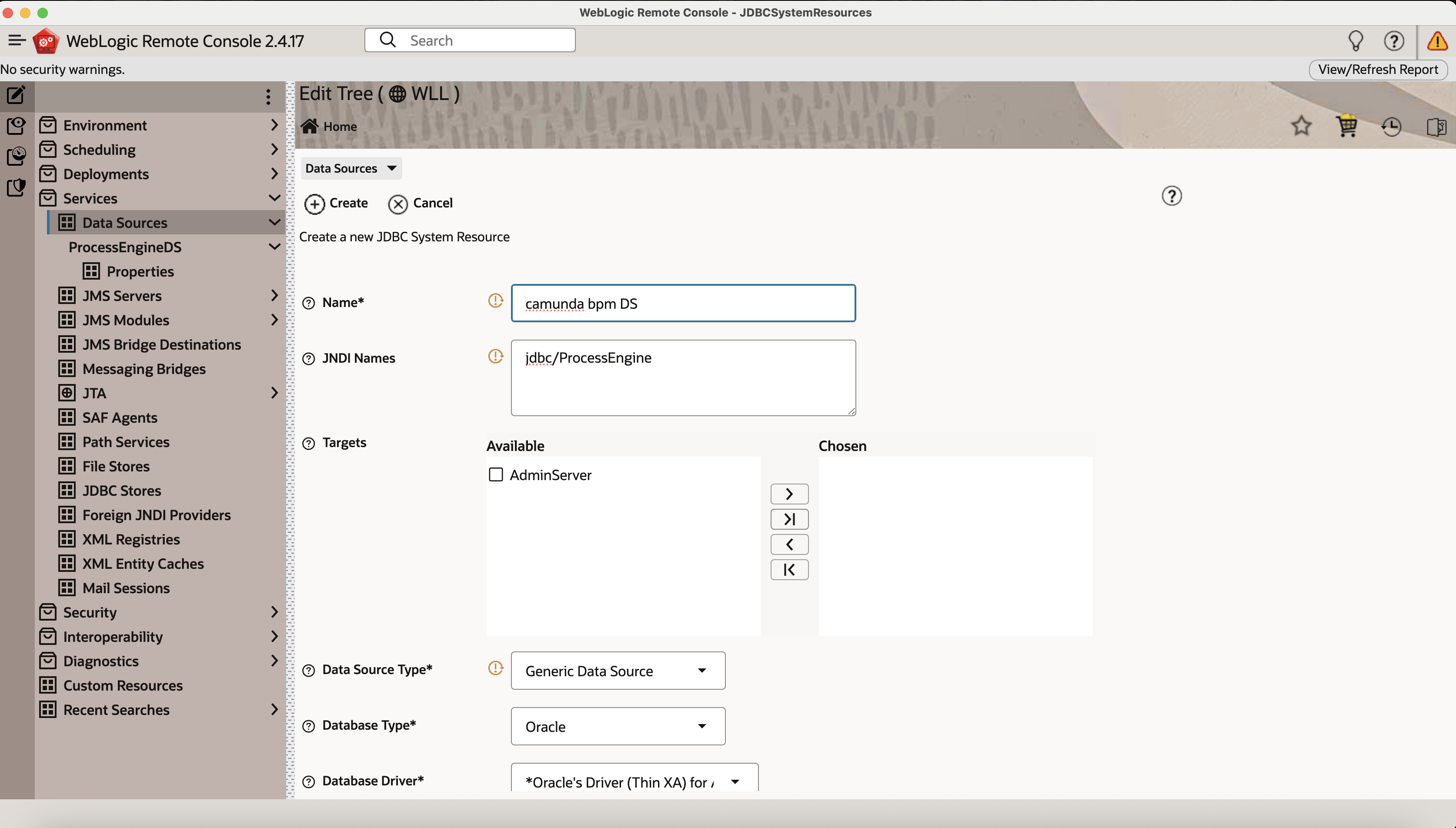 Fluxnova uses one or multiple process engines. Use the Oracle WebLogic Server Administration Console for the configuration of the datasources. The JNDI name of the datasource must be equal to the name used in the datasource-Element of the process engine(s) configured in the bpm-platform.xml.