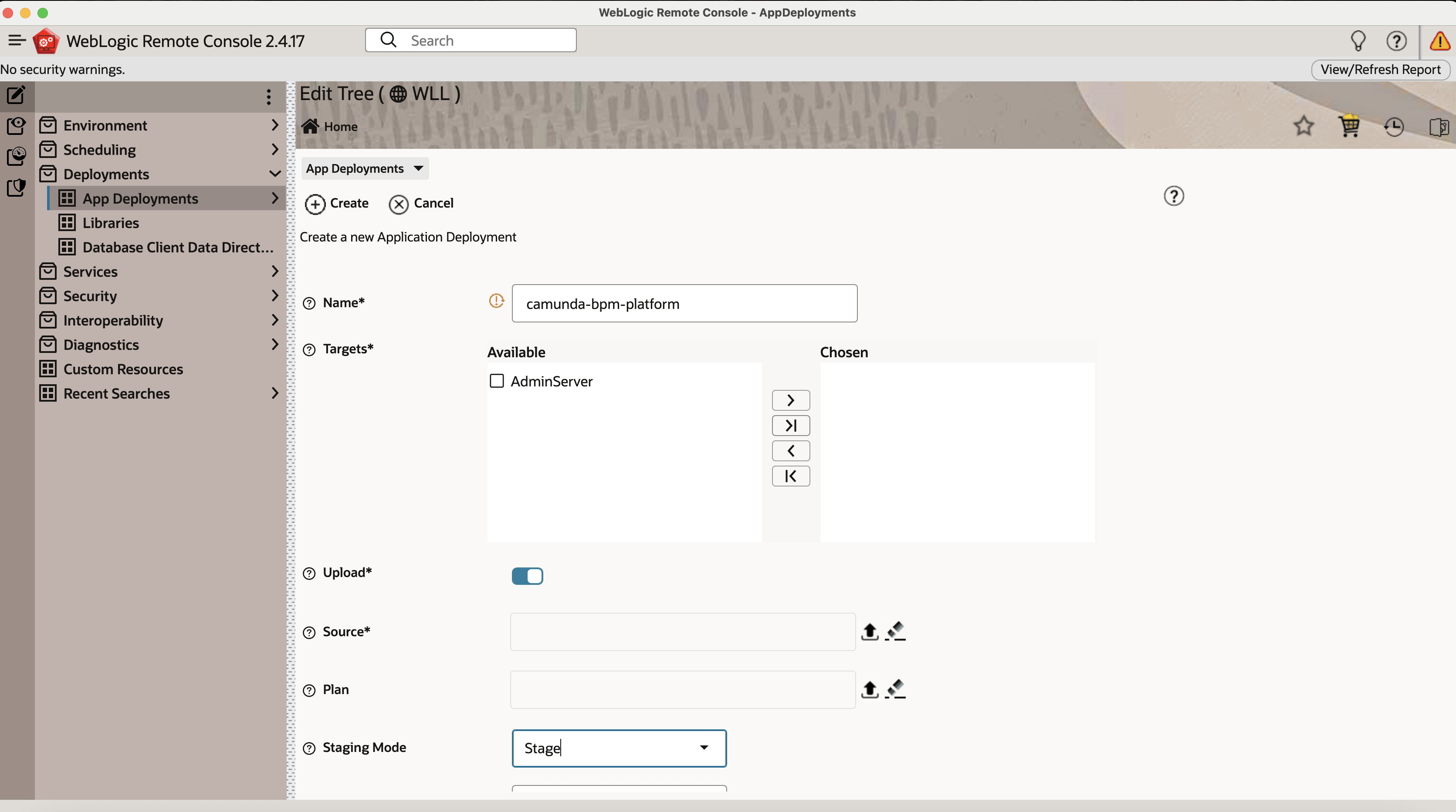 fluxnova-oracle-weblogic-ear-$PLATFORM_VERSION.earfrom the modules folder of Fluxnova for Oracle WebLogic Application Server distribution. - Click “Create” button.