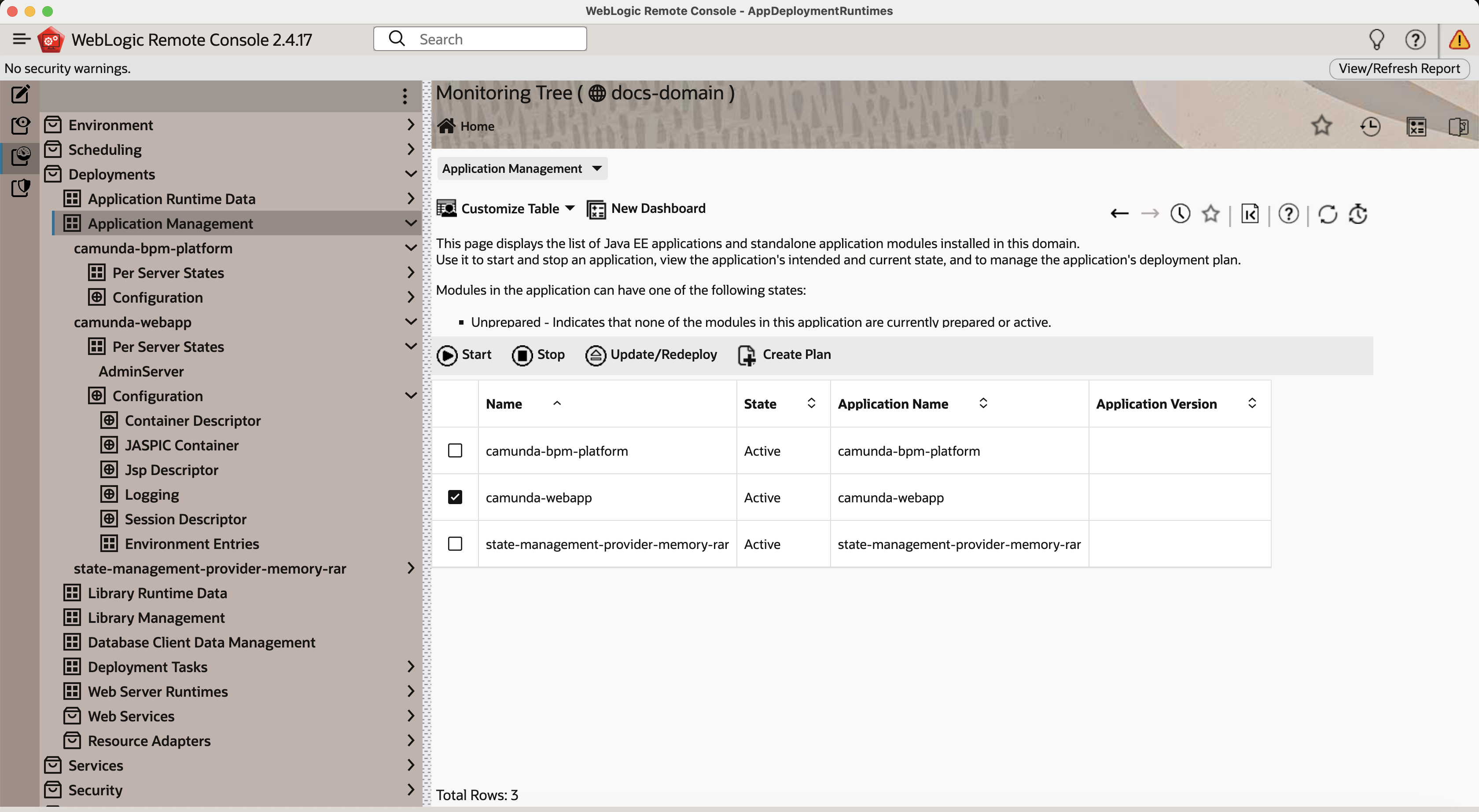 $WLS_DOMAIN_HOMEpoints to the Oracle WebLogic application server domain directory (typically something like/opt/oracle/WebLogic/domains/mydomain).$PLATFORM_VERSIONdenotes the version of Fluxnova you want to or have installed, e.g.1.X.Y.$WLS_DISTRIBUTIONrepresents the downloaded Fluxnova distribution for the Oracle WebLogic Application Server, e.g.,fuxnova-oracle-wls-$PLATFORM_VERSION.zip.
