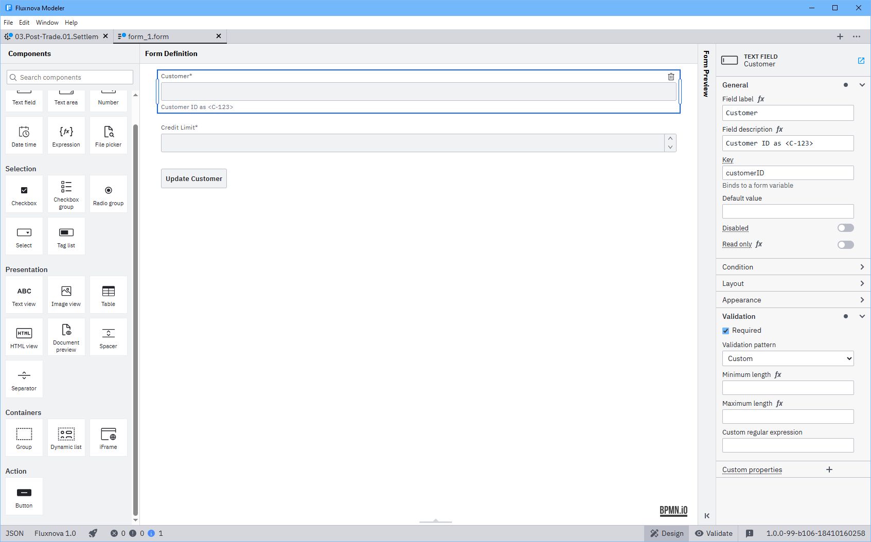 The Fluxnova Forms feature allows you to easily design and configure forms. Once configured, they can be connected to a User Task or Start Event so to implement a task form in your application.