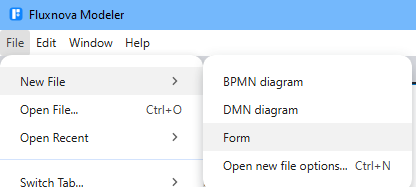To start building a form, in the File menu click Create new Form (Fluxnova Platform or Cloud).