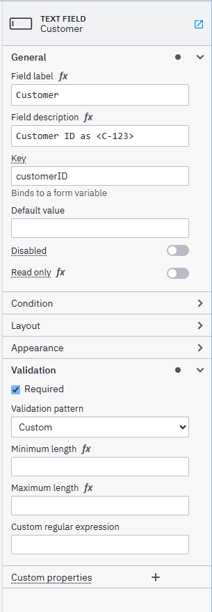 In the properties panel on the right hand side, you can view and edit attributes that apply to the currently selected form element. Please refer to the Fluxnova Forms Reference to explore all configuration options for form elements.