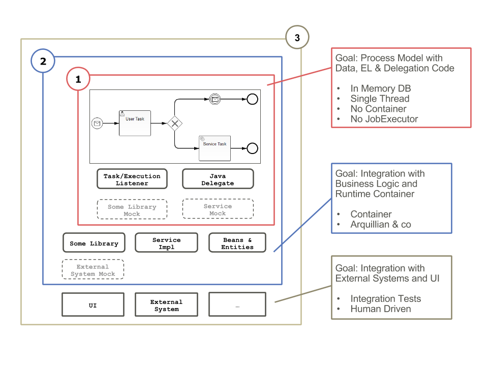 To test this application, all components, including the application server itself, need to be present and the external systems need to process the JMS messages. This makes it hard to write focused tests. However, by looking at the process itself, we find that there are many aspects of it that we can test without having the complete infrastructure in place. For example, if the process data is present, the Expression Language conditions can usually be tested without any additional infrastructure. This already allows asserting that the process “takes the right turn” at a gateway given a set of input data. Next, if the EJBs are mocked, the delegation logic can be included in such tests as well. This allows asserting that wiring of the delegation logic is correct, that it performs correct data transformation and mapping and that it invokes the business logic with the correct parameters. Given that the Fluxnova engine can work with an in-memory database, it now becomes possible to test the BPMN process “in isolation”, as a unit test and assert its local functional correctness. The same principle can be applied to the next “outer layers” of the system, including the business logic and external systems.