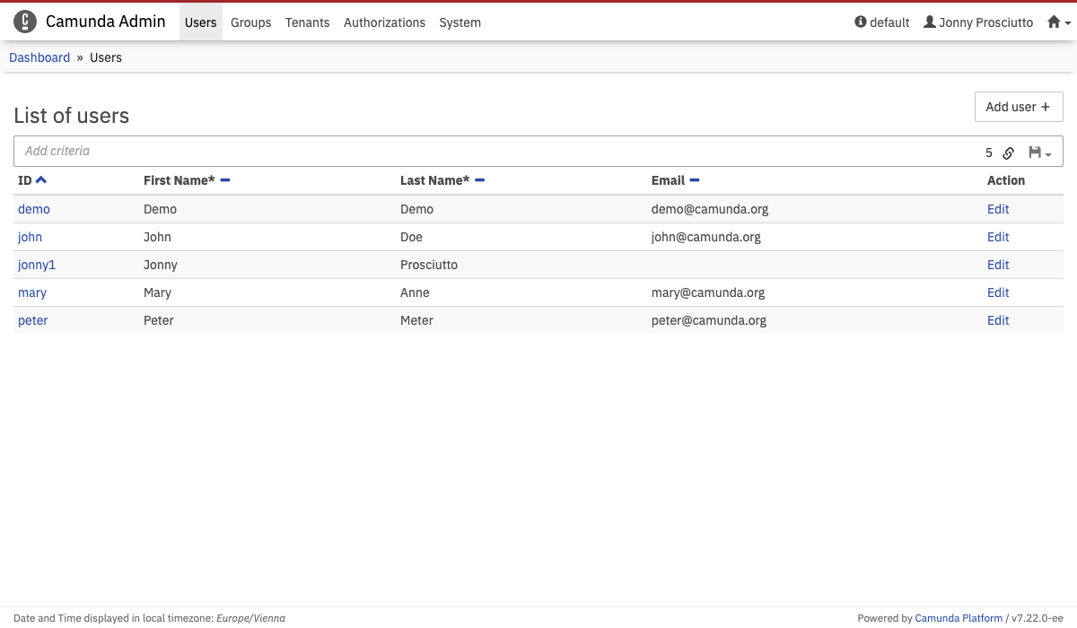 Users who belong to the group fluxnova-admin (default set by the invoice receipt demo process application) have administrator privileges. There must be at least one member in this group, otherwise the initial setup screen appears. Besides user- and groupmanagement, as administrator you are able to define authorization rules for a variety of resources. See the chapter on Authorizations for more details.