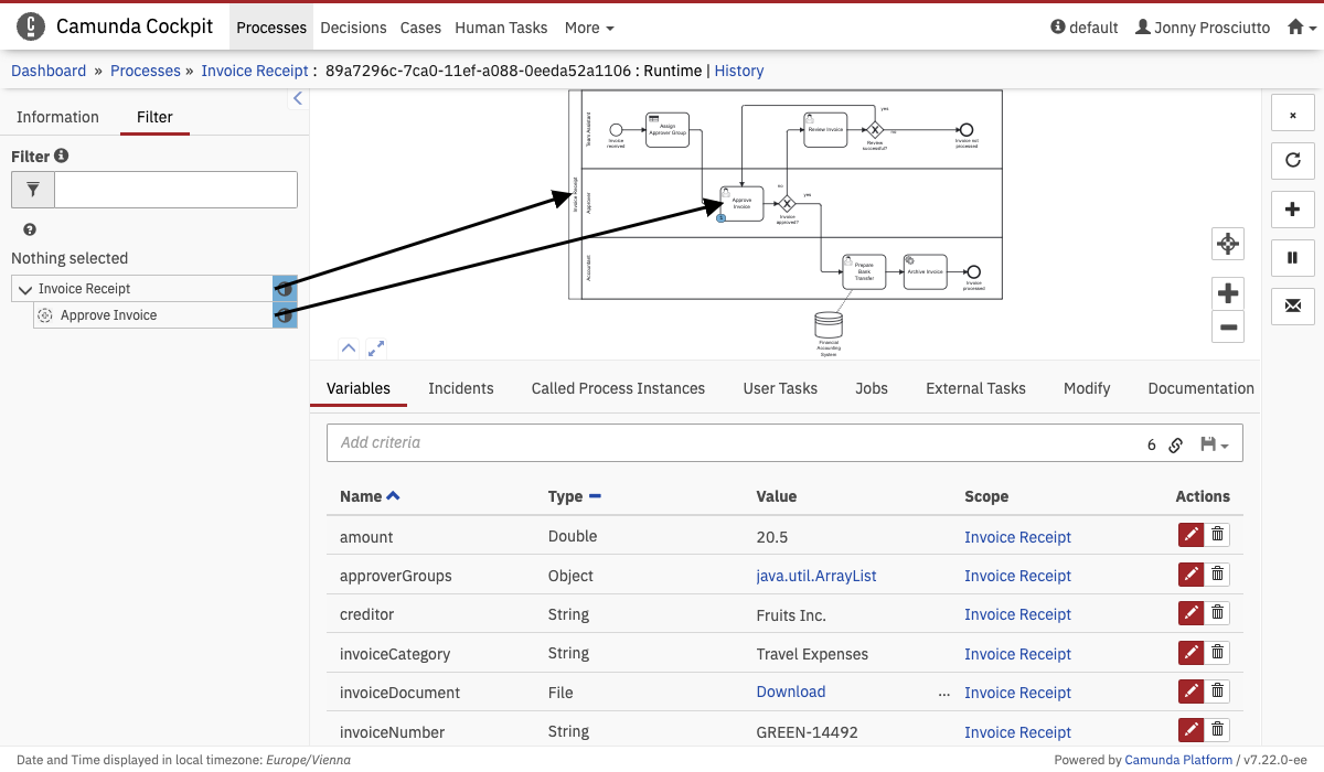 Open the process instance view by selecting a process instance from the process definition view instance list. This view allows you to drill down into a single process instance and explore its running activities as well as the variables, tasks, jobs, etc. Beside the diagram view the process will be displayed as an activity instance tree view. Variables that belong to the instance will be listed in a variables table of the detailed information panel. Now you can select single or multiple (‘ctrl + click’) flow nodes in the interactive BPMN 2.0 diagram or you can select an activity instance within the activity tree view. As diagram, tree view and variables table correspond with each other, the selected flow node will also be selected in the tree and the associated variables will be shown and vice versa.