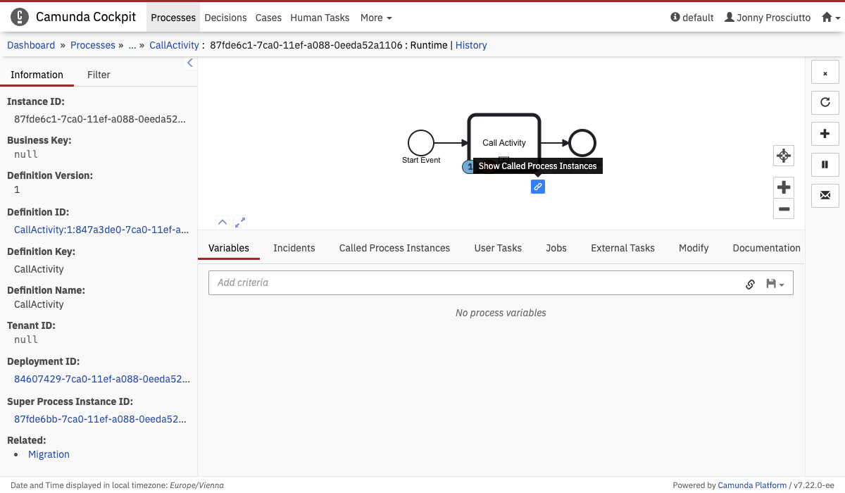 Use the detailed information panel to get an overview of the variables, incidents, called process instances, user tasks and external tasks that the process instance contains.