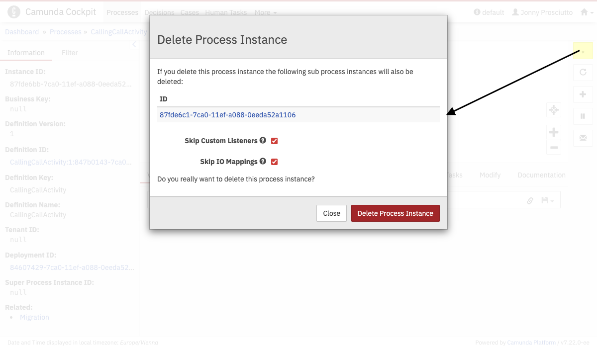In the process instance view you can cancel a single process instance. Hit the button on the right side. In the dialog that appears, you can choose to skip custom listeners and to skip I/O mappings. After you have completed this step, a confirmation dialog appears and the runtime data of the canceled instance is deleted.