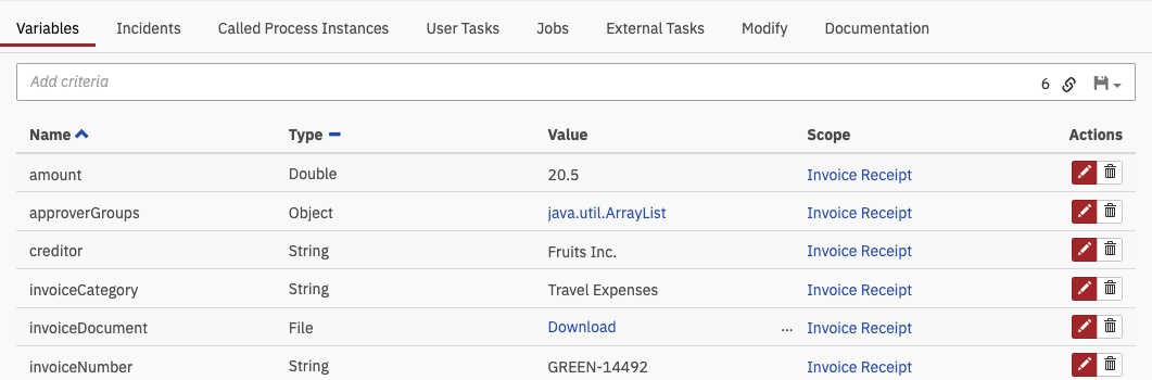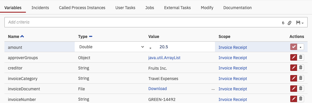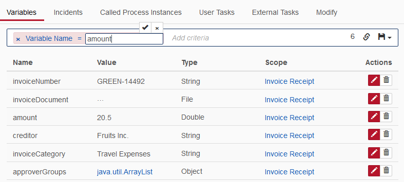 In the variables tab, you can filter for variables by variable name, activity instance id and variable value by using search pills. You can filter variable values with the type String