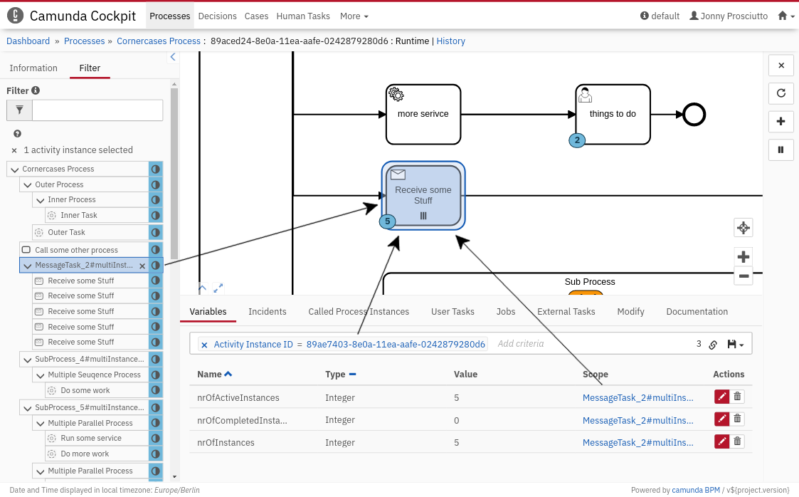 The activity instance tree contains a node for each activity that is currently active in the process instance. It allows you to select activity instances to explore their details. Concurrently, the selected instance will be marked in the rendered process diagram and the corresponding variables will be listed in the detailed information panel.